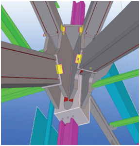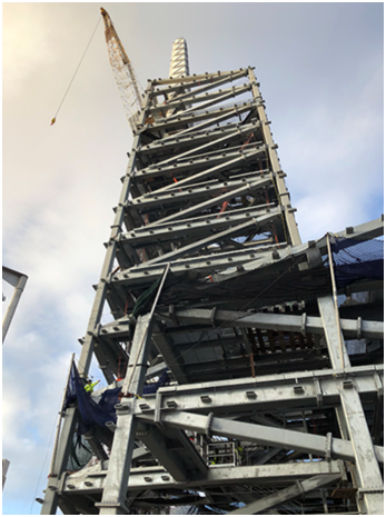 The building's unique shape is defined by special systems on the fifth and 12th floors, with engineers using custom steel connections and a mix of wide-flange sections, box columns, and built-up plate girders. A 128-foot steel spire, assembled at the top, includes diagonal stiffeners to control wind and prevent icing, designed following wind tunnel tests.